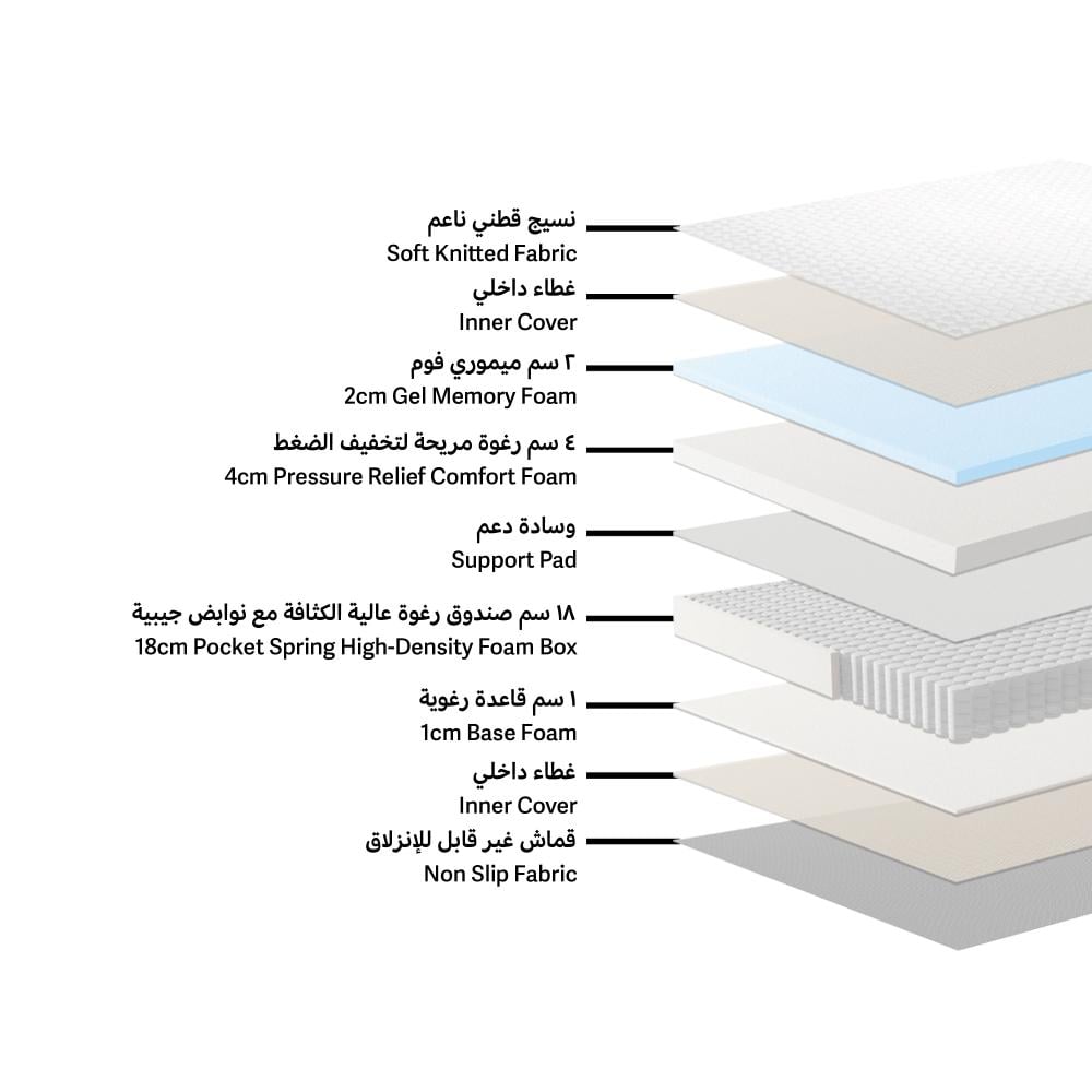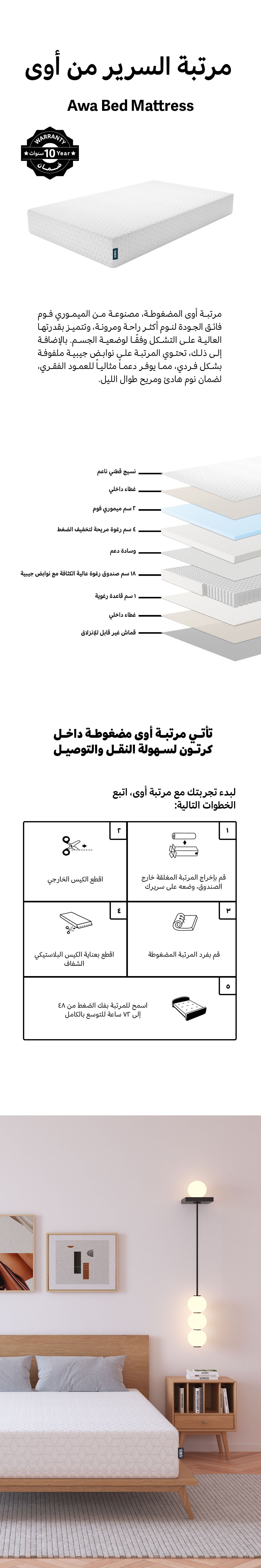 مرتبة أوى المضغوطة مصنوعة من الميموري فوم فائق الجودة، مما يوفر نومًا أكثر راحة ومرونة، حيث تتميز بقدرتها العالية على التشكل وفقًا لوضعية الجسم. بالإضافة إلى ذلك، تحتوي المرتبة على نوابض جيبية ملفوفة بشكل فردي، مما يوفر دعماً مثالياً للعمود الفقري لضمان نوم هادئ ومريح طوال الليل.