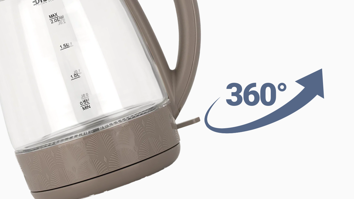 • غلاية إديسون مصممة علشان تخدمك بكل راحة ومرونة. بفضل القاعدة الدوارة 360 درجة، تقدر ترفع الغلاية وتضعها من أي اتجاه، وبأي يد، يمين أو شمال، بدون أي قيود.
