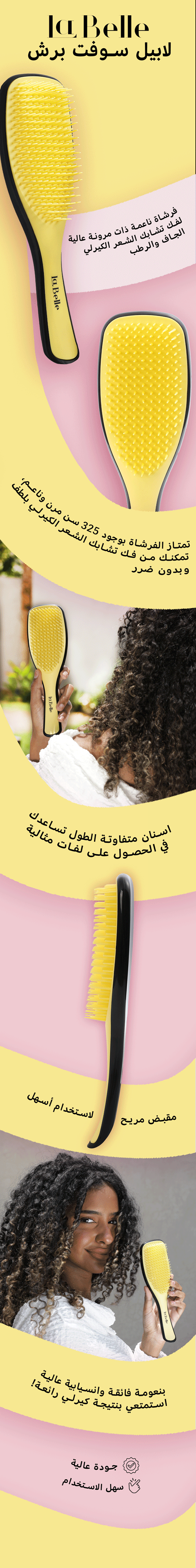 تمتاز فرشاة لابيل بـ 325 سن مرن وناعم تمكنك من فك تشابك الشعر الكيرلي بلطف و بدون ضرر