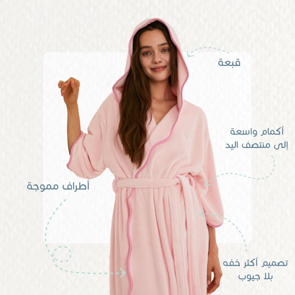 تتميز بقبعة و أكمام واسعة تغطي ثلثي الذراع، وستبهرك بقوة امتصاصها للماء ونعومتها المثالية للبشرة الحساسة، مما يجعلها خياراً مثالياً للاستخدام اليومي.