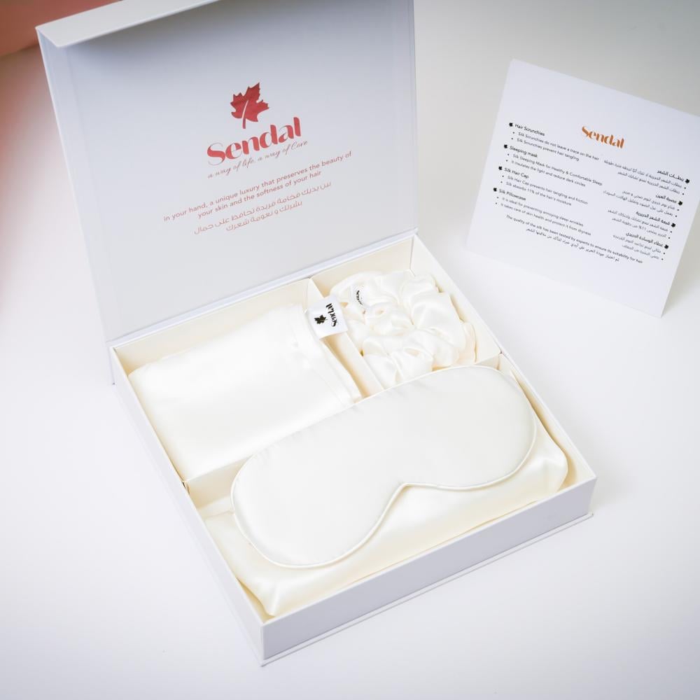تحتوي المجموعة على كيس مخدة حريري، ربطتي شعر، عصبة عين، وقبعة شعر، مما يجعلها مثالية للحفاظ على صحة بشرتك وشعرك أثناء النوم.